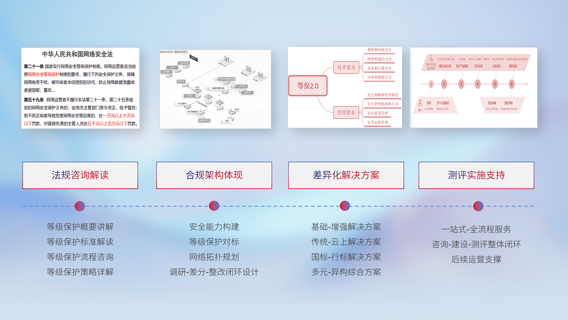 通过专业的法律咨询解读、、、、合规架构体现、、、差异化解决方案、、、测试实施支持等服务,,,为客户量身打造等保合规体系。。